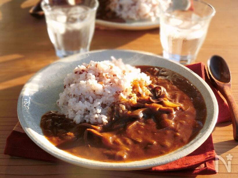野菜をたっぷり使ったキーマカレーです。マッシュルームやレンズ豆が食感のアクセントに。水気が少ないので、ごはんだけではなく、パンやナンにも合いそうです。