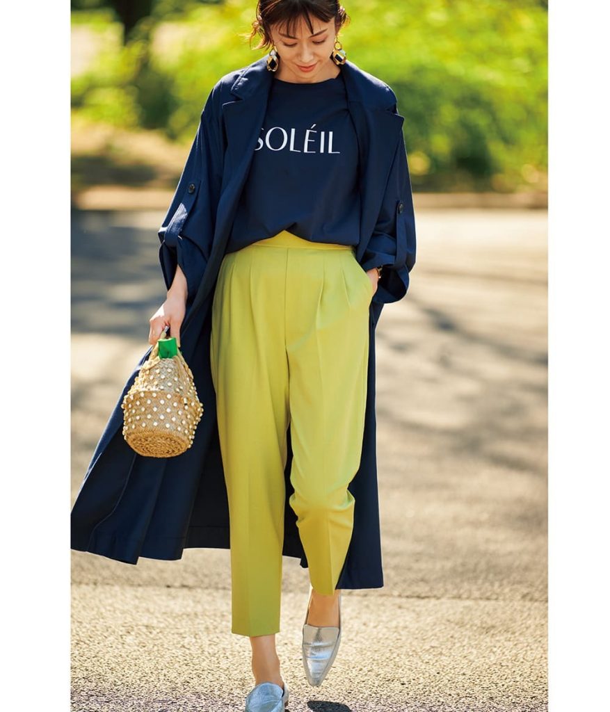 イエローパンツ¥4,510(グローバルワーク/アダストリア)ネイビートレンチコート¥5,990(アメリカンホリック/アメリカンホリック プレスルーム)ロゴTシャツ¥2,290(Pierrot)かごバッグ¥88,000(ル ナイン/TOMORROWLAND)シューズ¥22,000(エフ バイ ウェルフィット/ダイアナ 銀座本店)ピアス¥4,320(アビステ)バングル¥9,460(フル オブ グレイス/ZUTTOHOLIC)