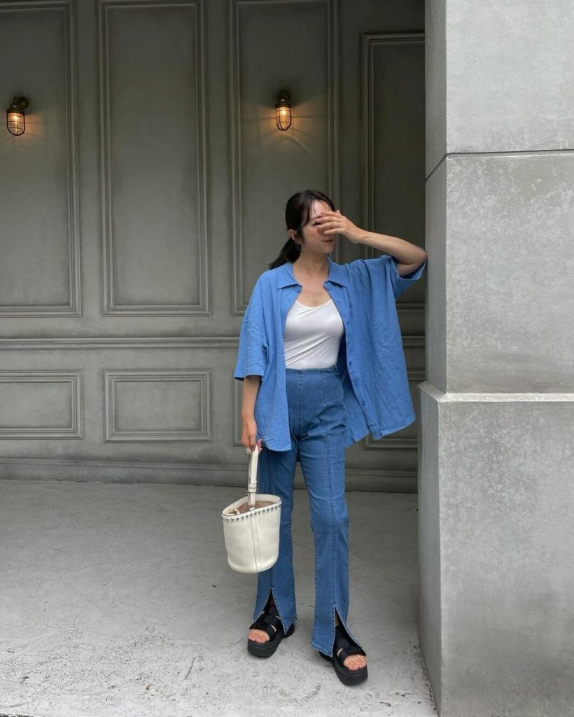 ハイライズにセンターライン、フロンスリットなど脚をすらりと長く見せるディティールが満載のジーンズ。ハイブラのようなデザインで、プチプラだというから驚きです。全身をブルーでまとめると爽やかで、モデル級の美脚コーデに。