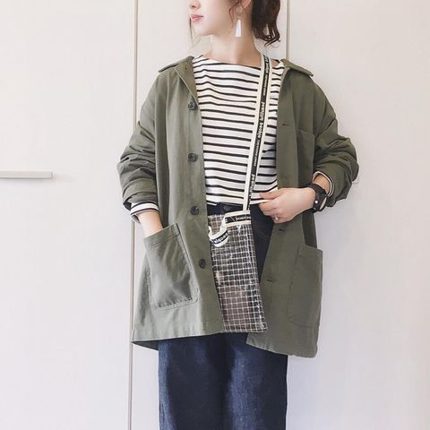 カーキのアウターを羽織れば、メンズライクな配色のスタイリングが叶います。定番の組み合わせには、PVC素材のバッグを合わせて今っぽさをアピールしても素敵ですね。
