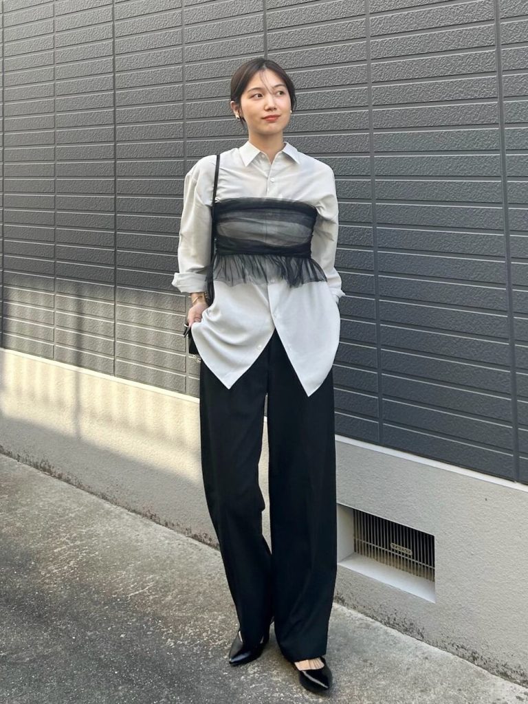 ビスチェをシャツにレイヤードした2024年を代表するトレンドコーデが完成。チュール素材で軽く、透け感のある生地が抜け感とこなれた雰囲気を醸し出してくれます。いつものコーデを新鮮に仕上げたい方におすすめの旬顔コーデです。