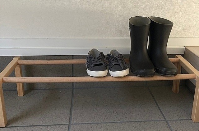 靴は子どもが自分でシューズウォールから出したりしまったりはまだ難しいため、シューズラックの上に置いています。