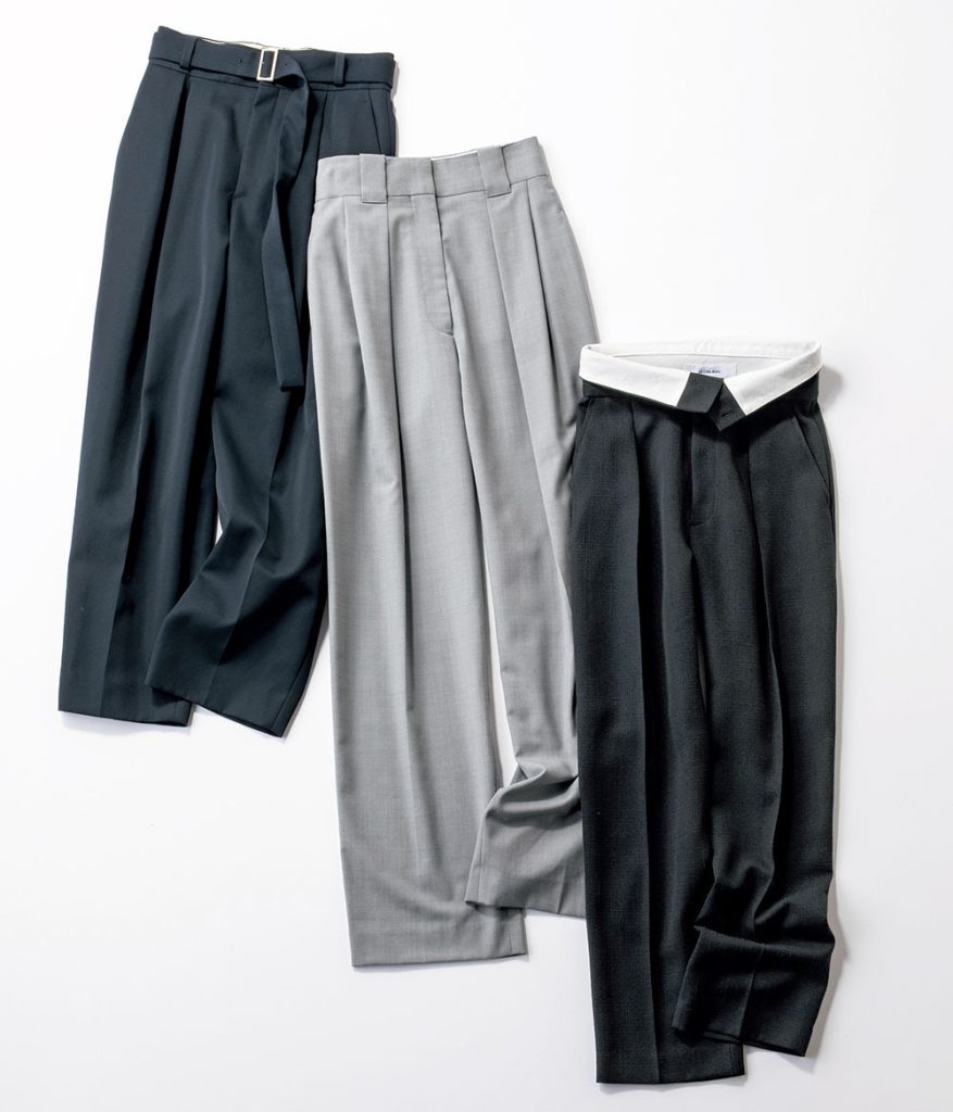 〈右〉白のチラ見せで今っぽさと軽やかさを足せる折り返しデザイン。パンツ¥30,800(LE CIEL BLEU/ルシェルブルー総合カスタマーサービス)〈中〉スタイルアップ&リッチ感のあるツータック。パンツ¥39,600(チノ/モールド)〈左〉定番のネイビーパンツも太パンツにスライドが今季の正解。トレンドのベルト付きなら簡単。パンツ¥61,600(カオス/カオス丸の内)