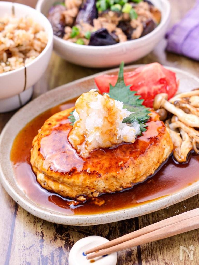 鶏ひき肉と豆腐で作るヘルシーで食べ応え満点なハンバーグです。大きめに成形しハンバーグに、和風あんをかけ、大根おろしと大葉をトッピング。さっぱりした口当たりでパクパクと食べられます。