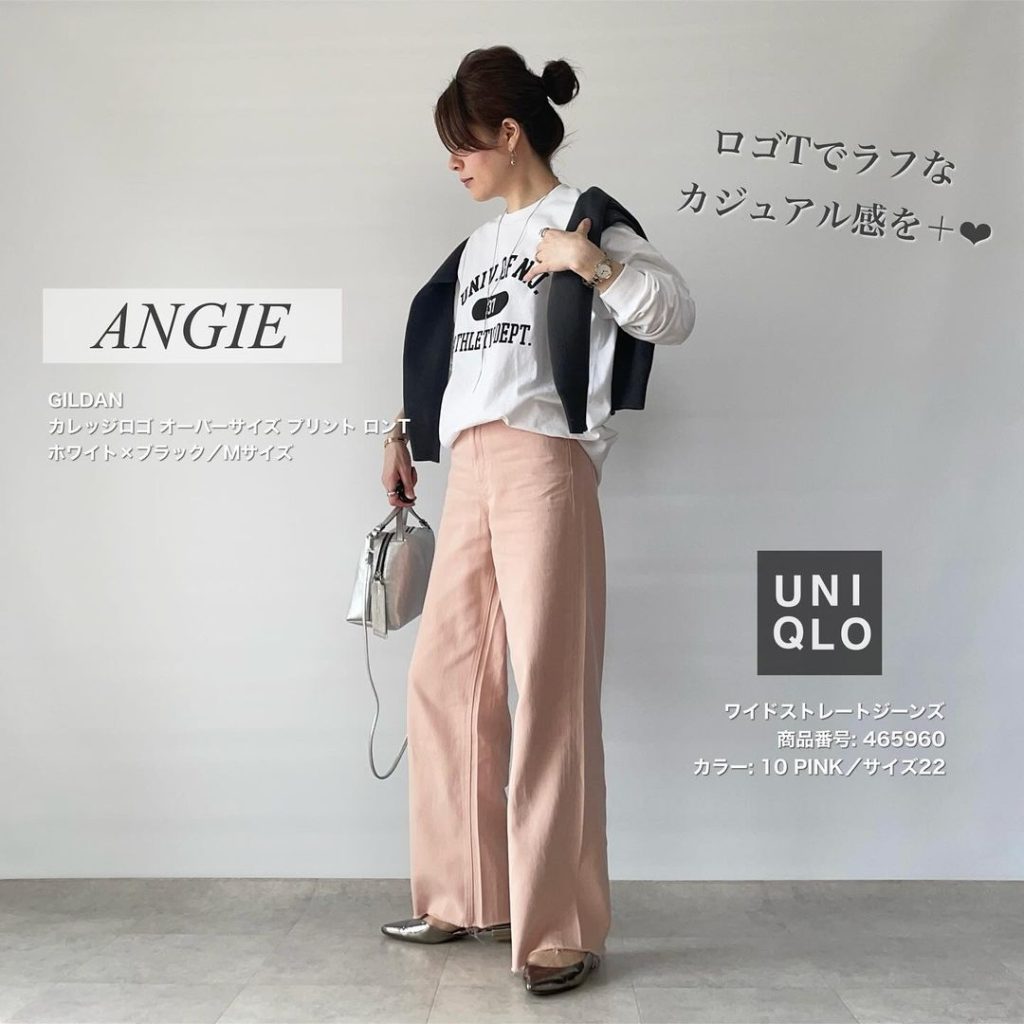 デニムとロンTのカジュアルコーデも、旬のピンクを混ぜるだけで一気にトレンド感がアップします。ピンクのワイドデニム、というだけで十分主張ができるため、むしろロンTは脇役に徹するのが正解。