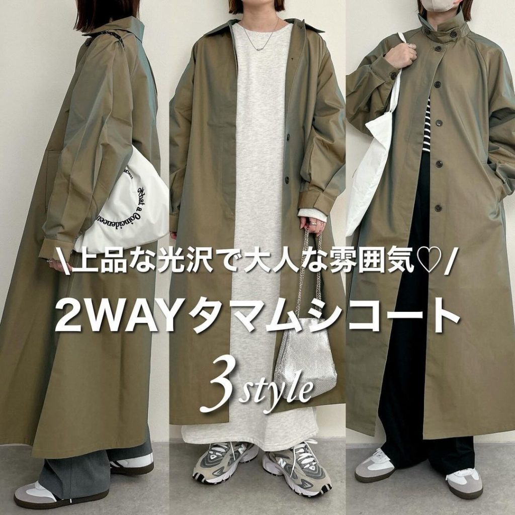 角度によって色味が変化する玉虫色のコートは、360°どの方向から見てもおしゃれです。スタンドカラーにもなるステンカラーで2WAYコーデを楽しんで。長め丈のAラインで全身の体型カバーを叶えます。