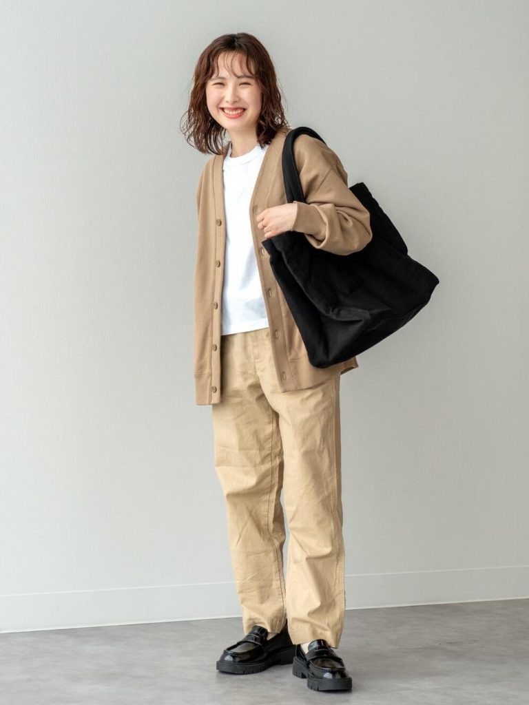 なめらかな表面感とほどよい厚みで、春の羽織りとしてちょうどいいスウェットカーデ。寒い日はさらにアウターを重ね着するのもありです。サイドポケット付きで実用性もあります。ベージュコーデはナチュラルな魅力満載。