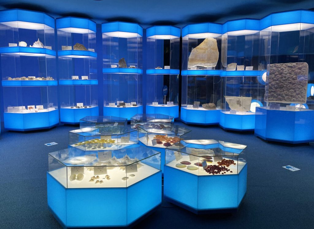 博物館のテーマは「宇宙の進化と生命の歴史」。先カンブリア時代から現代にかけて地球の歴史と生物を学べるよう、約2000点の化石や鉱物が展示されています。