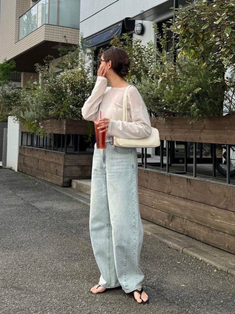 ⑥メッシュトップス×バレルレッグジーンズ=大人カジュアルコーデ