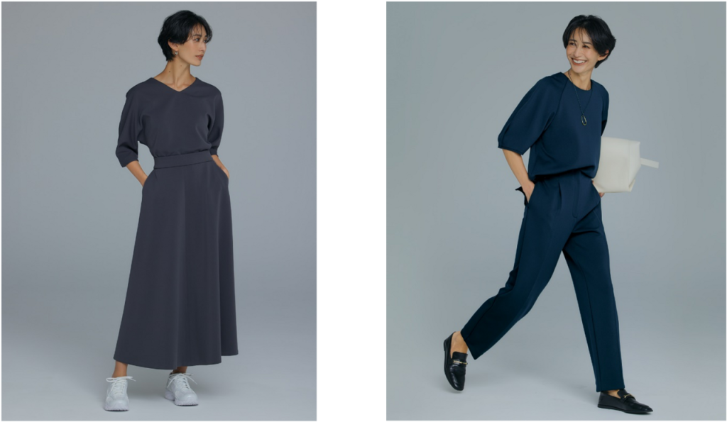 「スキューバジャージーシリーズ」の素材は、高い伸縮性と接触冷感、マシンウォッシャブルと機能性ばっちり。さらにピリング(毛玉)ができにくいのも嬉しい特長。程よい厚みとハリ感で立体感のある女性らしいデザインに仕上がっています。