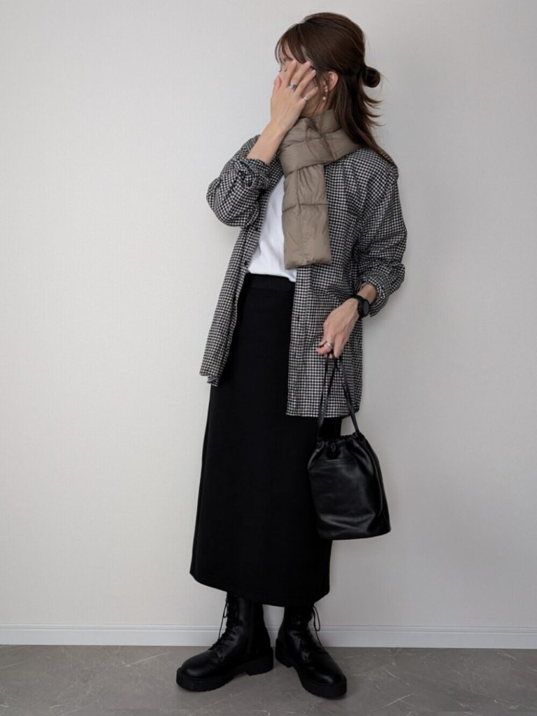 マリメッコとのコラボレーションでも、パデッドマフラーが発売されています。最もコーデに取り入れやすいのが、グレーとブラックのコンビ。オフィススタイルにも合わせやすく、コーデ全体がピリッと引き締まります。