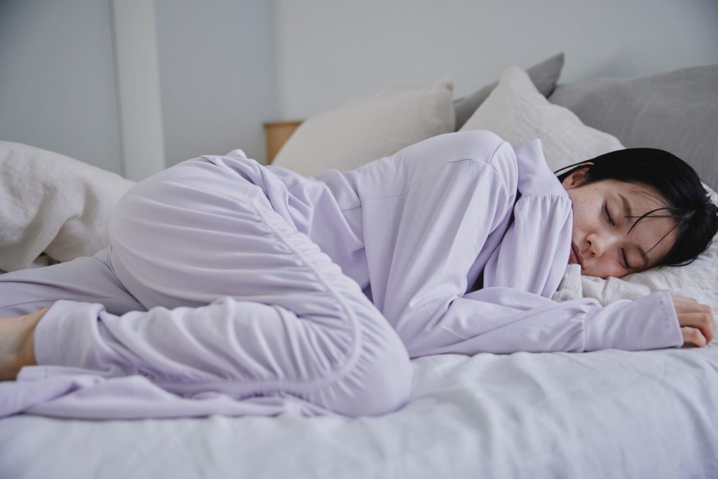 どんな肌色にも馴染みやすいペールラベンダーカラーが可愛い♡ブルベさん向きに見えますが、イエベさんにも着やすい色になるように、何度も調整を重ねられています。ルームウェアなのにシャレ見えが叶うパンツのギャザーは、寝るときに邪魔にならないディテールなのも◎。ちなみにポケットもついていて、スマホもすっぽり入ります。
