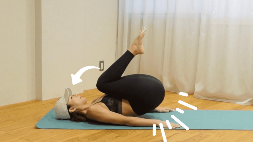 ②息を吐きながら両膝を胸の方へ引き寄せて、少し尾骨が浮く程度までお尻を持ち上げます。