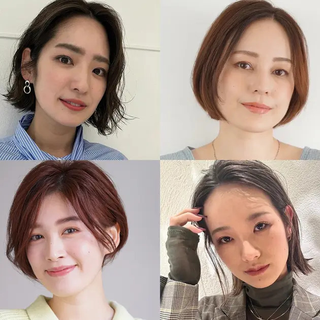 根強い人気のショートボブヘアは、こめかみまわりをカバーすることでさらに小顔効果を高めて。