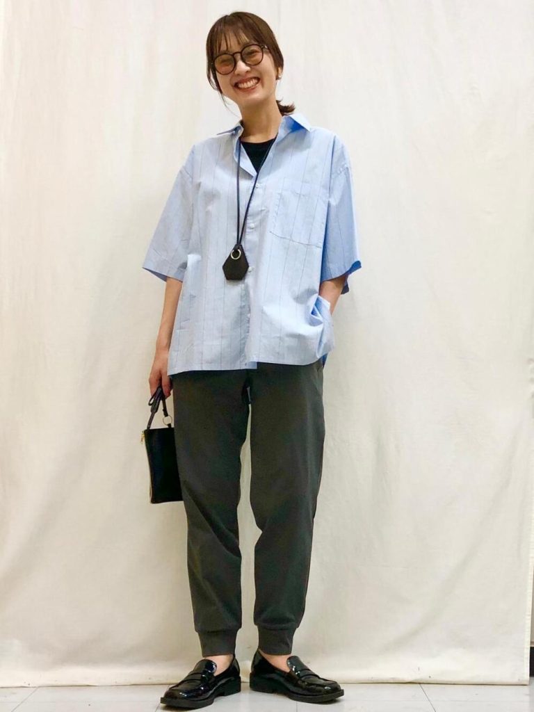 スポーティーな雰囲気が漂うジョガーパンツも、在宅ワークの日ならOK!オンラインミーティング用にトップスはシャツを着て、画面に映ってもきちんと感漂う装いに。このままお出かけもできるので、インナーはカップ付きタンクトップを着て重ねすぎないように調整を。