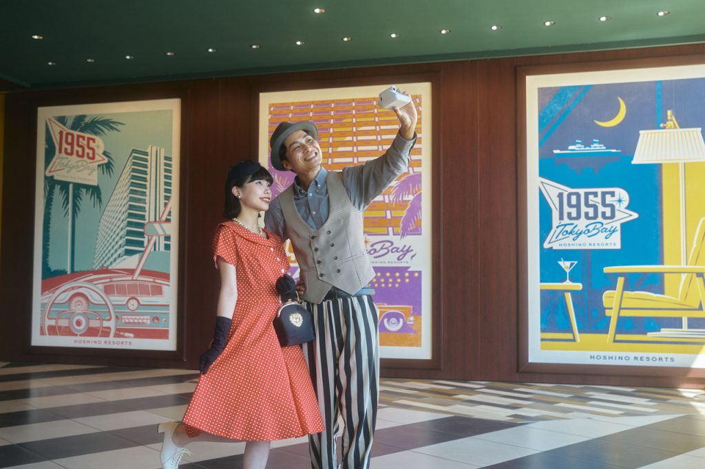 衣装を身にまとったら、出発前や帰ってきた後に館内のフォトスポットでも写真撮影を楽しむのがおすすめです。1955 東京ベイの館内は、1955年頃のアメリカの世界観がモチーフ。ルームキーと同じデザインのアートウォールの前や、パブリックスペースの「2nd Room」など、衣装に合わせて様々な場所で撮影を楽しめます。期間中は「2nd Room」が秋の収穫祭会場に大変身!仮装をしたままアメリカのハロウィーンの夜も満喫できます。