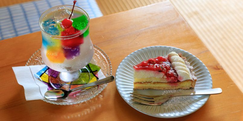 この立地、雰囲気も良いですが、メニューも素敵です。こちらは「きらきらゼリーソーダ」957円。ラムネジュースに、いろんな味のカラフルゼリーが入って見た目はキラキラ。シュワシュワラムネに、白川郷のおいしい水で作ったカラフルなゼリーがぴったりです。