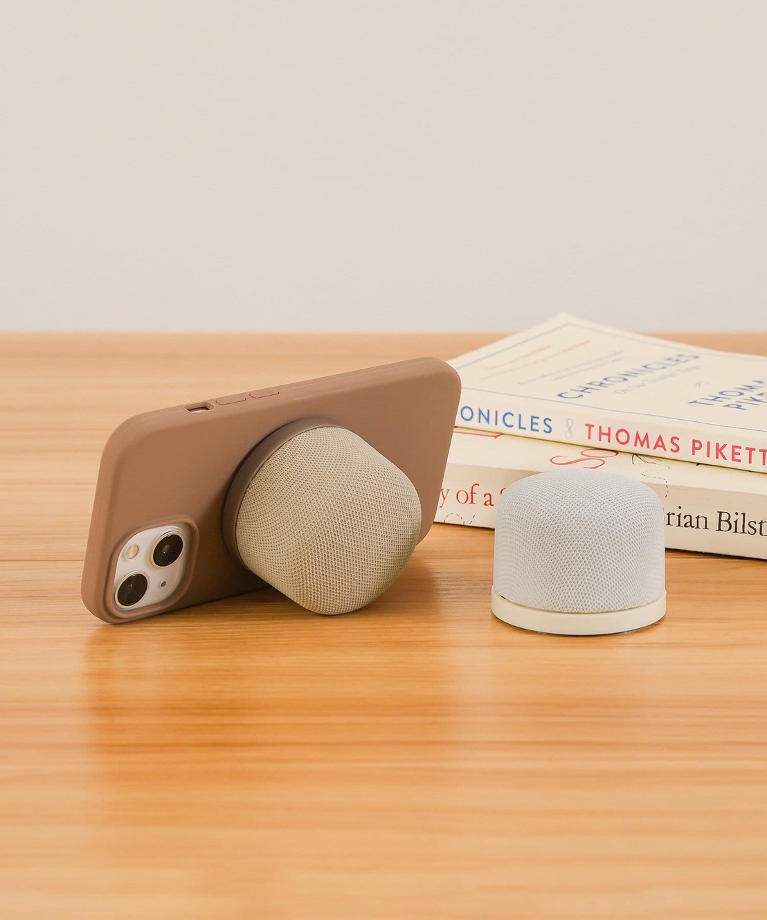 もちろんスタンドとしてそのまま置いてもOK。マグネットがくっつくスマホケースに装着すれば、スマホスタンドにもなり、動画視聴や通話にも便利です。コンパクトなので持ち運びも◎。カラーはアイボリーとブラウンの2色です。
