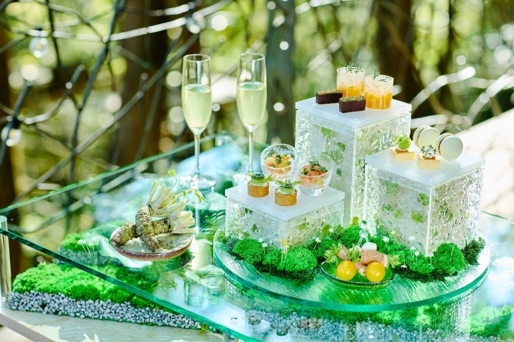 アフタヌーンティーを楽しむのは、樹齢300年を超えるクスノキが宿る「森の空中基地 くすくす」にあるツリーハウスです。わさびが育つきれいな湧水やわさび田をイメージして、テーブルはわさびの花や苔を表現。天井は棚田から水が流れている風景をイメージした装飾です。水の透明感をイメージしたプライベートな空間で、爽やかな春の訪れを感じながら、ゆっくりと流れる時間を楽しむことができます。