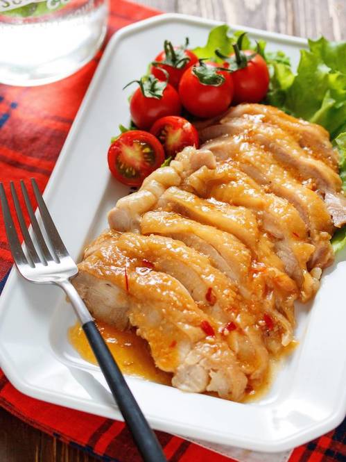レンジで蒸した鳥もも肉にピリ辛のゴマダレをたっぷりかけていただく一品です。さっぱりしたお肉と濃厚なゴマだれの相性がよく、リピ決定な美味しさです。