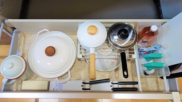立てて収納できない大きめの鍋や土鍋は、市販のシンク下収納ラックを活用するのがおすすめ。