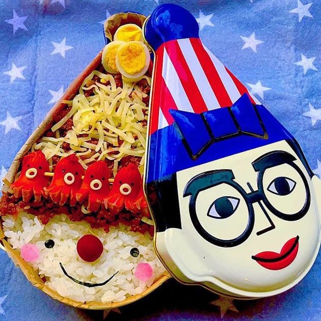 ひと目見ただけで思わず笑ってしまうこちらのカンカン弁当。大阪の観光名物として人気のくいだおれ太郎です。ユニークなカンカンがインパクト絶大ですよね。