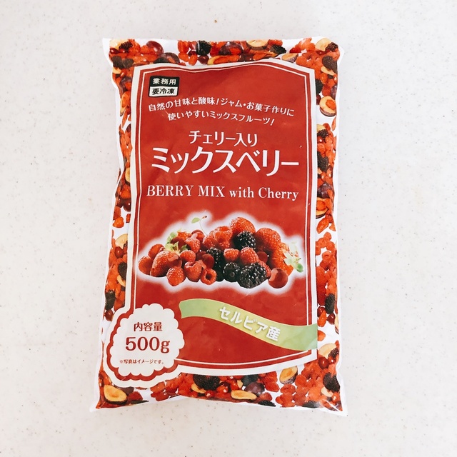 中身は、ストロベリー、ラズベリー、ブラックベリー、サワーチェリーです。よく見かけるミックスベリーには、サワーチェリーではなくブルーベリーが入っていることが多いのですが、ブルーベリーは単体でも購入できるので、合わせて使ってみてもいいなと思っています。