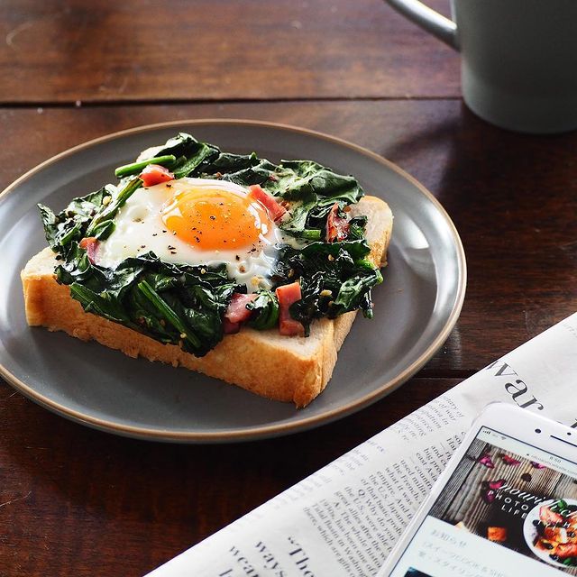 卵×ベーコン×チーズでカルボナーラ風に仕上げたトーストレシピです。ほうれん草ものせて、これ1枚で栄養バランスもばっちり。とろ〜り卵をからめていただきます。