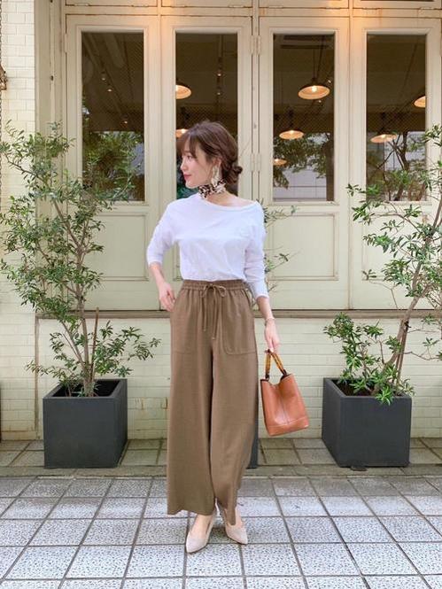 暑さが残る日には、爽やかな白トップスを。ボトムスにはライトブラウンのパンツを選び、秋らしく、そして優しげな印象へと導きましょう。お仕事後に予定がある日は、大ぶりのピアスやスカーフなどを添えて、顔周りを華やかに♡