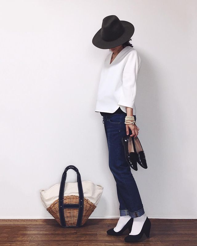 綺麗めなトップスを、デニムとソックスでカジュアルダウン。程よくゆったりとしたシルエットなので、妊婦さんでも楽に着ることができます。