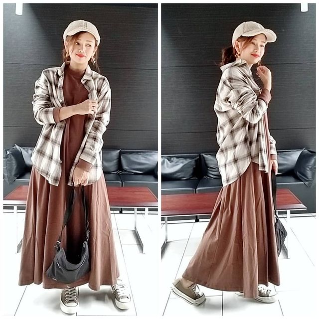 秋も人気継続のマキシ丈ワンピ。秋はチェックシャツをゆったり羽織ると、季節感と今っぽさを底上げできます。小物もカジュアルなものをチョイスすることで、こなれ感ある仕上がりに。