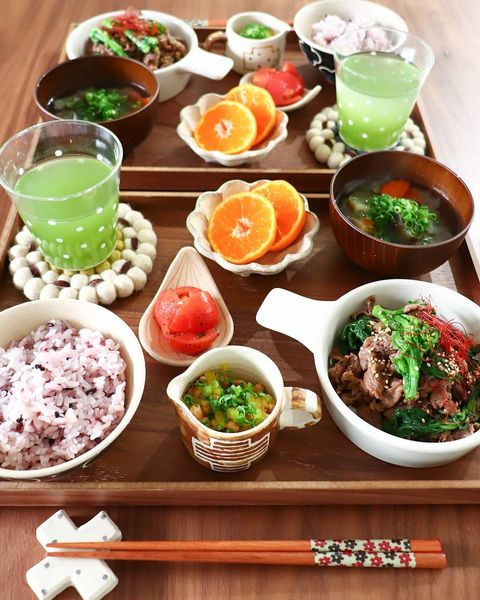 牛肉炒めに菜の花をプラスすれば、彩りも栄養価もアップしますね。ごはんももち黒米で、添えられた副菜にも野菜がたっぷり。青汁もプラスされていて、健康を意識した食事を摂りたい今、ぜひ真似したい献立です。