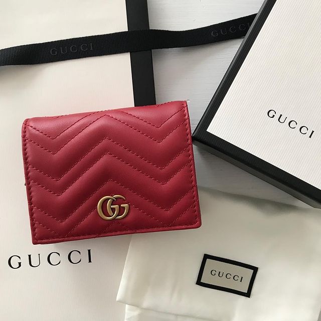 GGロゴが目を引くグッチのミニ財布。上品なキルティングレザーと、鮮やかなハイビスカスレッドが大人のおしゃれを演出します♡
