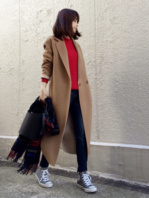 冬の時期なら、羽織物のコートはカジュアルなものは避けて、上品なロングコートを選びましょう。赤ニット×デニムとの相性がよく、品のある大人カジュアルが完成します。