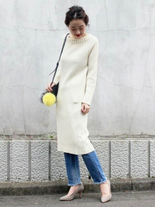 重くなりがちのニットワンピースを着こなすなら、適度な肌見せが重たくならないポイント。チラ見せが女っぽさをさりげなくアピールしてくれそう。