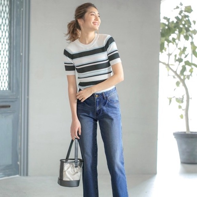 ボーダートップスとデニムパンツのカジュアル定番コンビ。