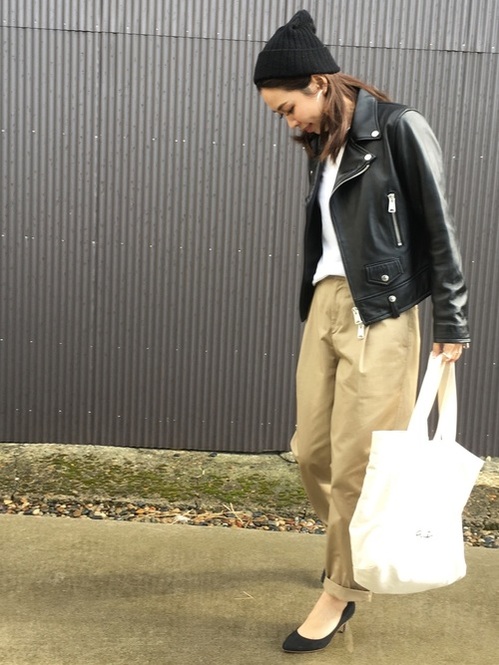 そんなベージュのチノパンを、グッとあか抜けたコーデにするには、トップスに違う素材のアイテムを持ってくる良いでしょう。ヌケ感のあるチノパンコーデが簡単に完成します。ショート丈のアウターと相性が良いので、ライダースやMA-1、Gジャンなどと合わせるのがおすすめです。