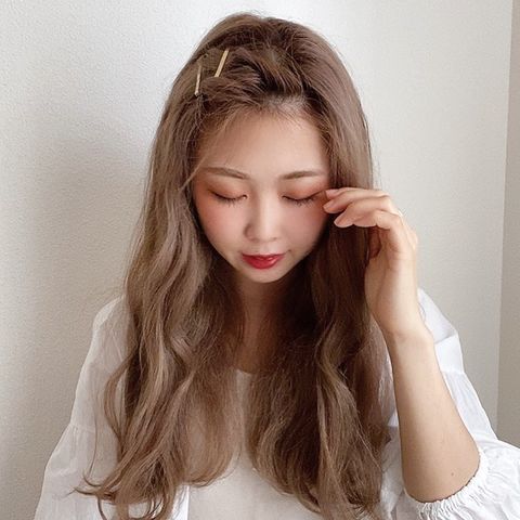 前髪とサイドの髪を合わせてスッキリまとめたハーフアップアレンジです。最初にアイロンでウェーブをつけておくのが、大人っぽく見せるポイントです。