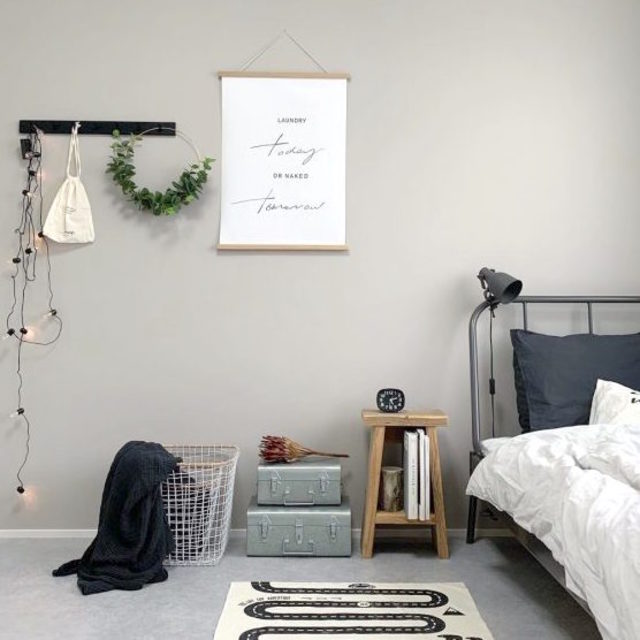 寝室の1面を単色のアクセントクロスに。グレーを一面入れるだけで、部屋に奥行きが生まれます。四方を白壁で囲うより、落ち着いた雰囲気に。