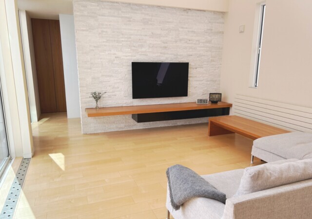 海の風景をモチーフにしたデザイン壁紙をリビングの1面に。ボーダー柄のように規則的ではないものの、視線が横に広がるデザインは、感覚的に部屋の幅を広く感じさせてくれます。