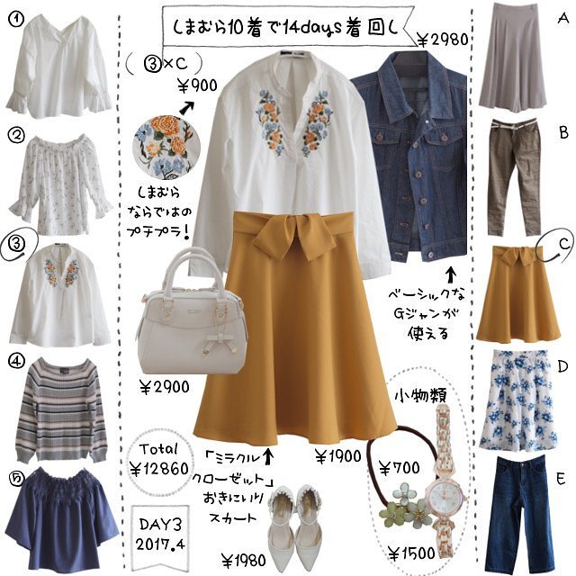 また、同じアイテムを着回ししたコーディネートも考えられており、大好きなしまむらのアイテムをたくさん着ようという、しまむら愛も感じます。