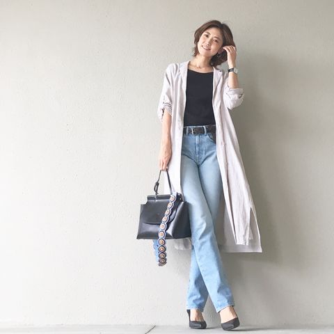 アクティブな印象のカーキパンツも、「カーディガン・バッグ・サンダル」の小物使いで、ぐっと上品なコーデに仕上がります。女性らしさを引き立てるには、「首・手首・足首」の3首を見せる事を心掛けて。「リブバレエネックT」なら、首をより綺麗に見せてくれます。