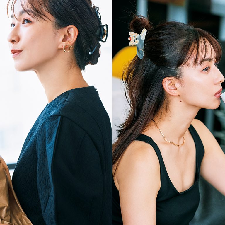グッチのハート♡ヘアピンが横顔のアクセント! ラフなまとめ髪も映える簡単ヘアアレンジテク[ハイブランド×春ヘア]