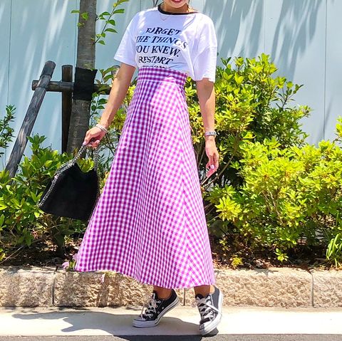 Tシャツ下手さん必見!女っぽさをプラスした“旬のロゴT”着こなしテク