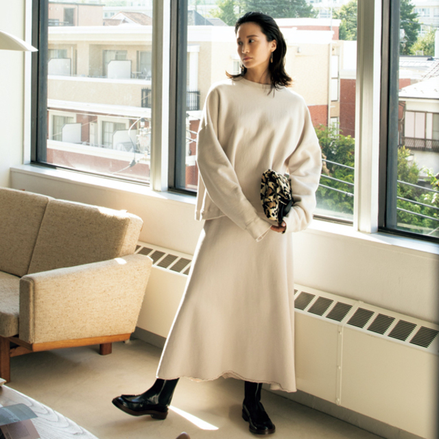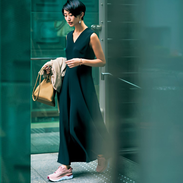 下半身の”細見え”バランスにタイトスカート×ぽってりスニーカーが効く