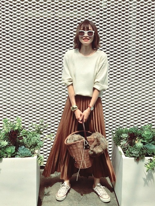 ニット¥13000/ジースターインターナショナル(ジースター ロゥ) キャミソール(カップつき)¥1900/SENSE OF PLACE by URBAN RESEARCH キュープラザ原宿店 スカート¥15000/カロリナ グレイサー ピアス¥1600/サンポークリエイト(アネモネ) バッグ¥10900/シップス 渋谷店(カシオペア)