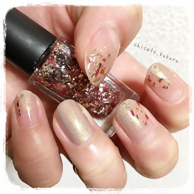 上手な塗りかけネイルのコツは、ネイルのハケを縦にサッと動かすことです。クリア系のカラーとラメを重ねると、ほとんど色がついていないように見えるのにニュアンスのあるネイルになります。