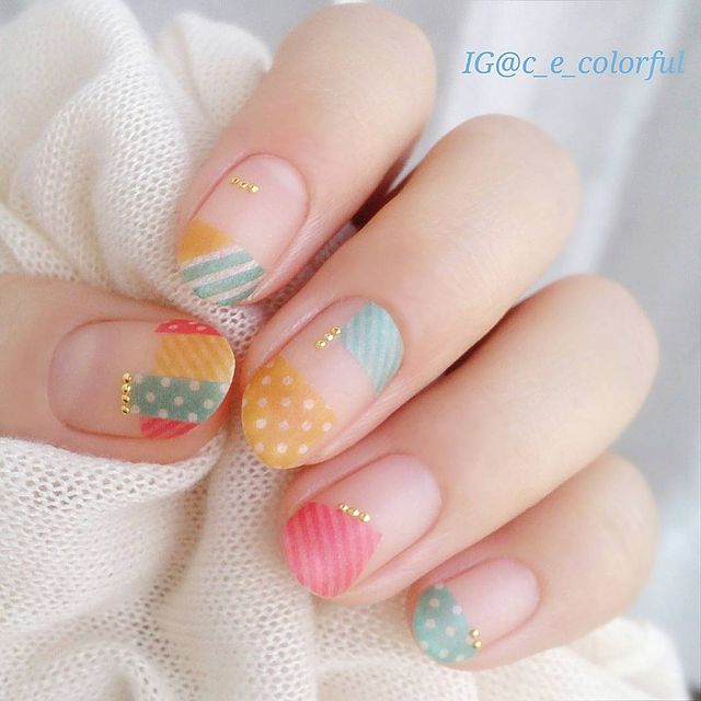 マステをちぎって無造作に貼り付けたデザインは、あえてテープ感を思いきり出すことでこなれ感アップに。リッチなストーンやパーツ使いで、マステを脇役にすると悪目立ちしません。