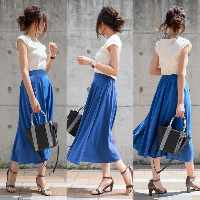 トップス×スカートの王道スタイルは、カラー合わせで夏らしさを意識。白に鮮やかなブルーを合わせれば、まわりまで爽やかな気分にしてくれそうな華やかコーデに。