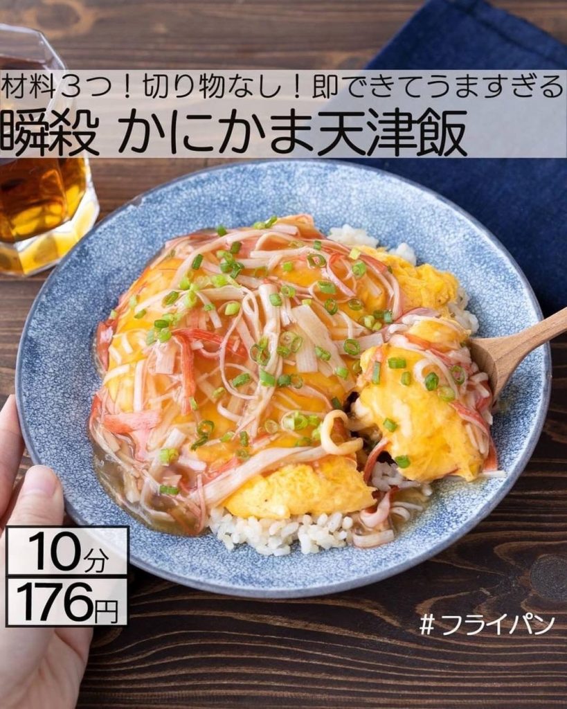 ふわふわに焼いた玉子とあんかけをのせるだけで簡単な天津飯。カニカマを入れると彩りがよく、うまみのある味わいになります。時短で簡単ですが、満足感は高め。白いご飯がもりもり進むでしょう。